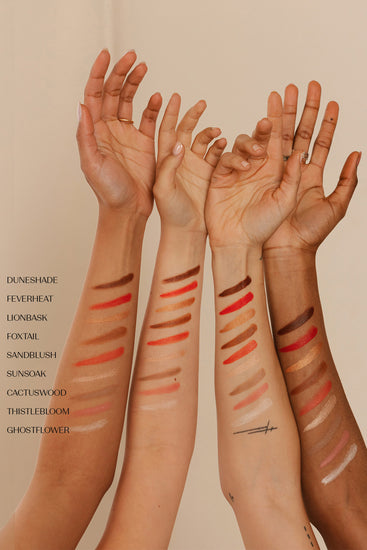 We formulate our products with all skin types in mind. The cream blush, bronzer, and highlight are formulated with a natural satin, skin-like finish, while Dewbeam balm is formulated with a high-shine, gloss effect infused with ultra-fine pearls. If you desire a more matte finish or have particularly oily skin, we recommend setting your look with powder to extend longevity, and avoid mixing dewbeam balm into the colour formulas to add unwanted shine. Instead, place dewbeam balm on top of your look for a controlled shine exactly where you want to glow.